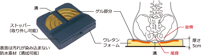 また、ゲルとウレ夕ンフォームの2層構造により坐骨部周辺にかかる圧迫力を低減します。