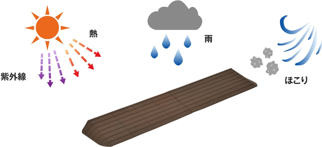 先端部分および両端は段差が小さく、滑らかな形状のため、すり足でもつまずきにくく、車いすや歩行器でも楽に走行できます。