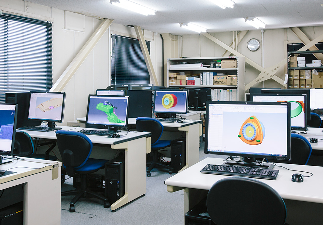 The CAD Room uses CAD software to create data describing the shapes of the parts customers require. Personnel use NX, CATIA Ver. 5, and SOLID-WORKS. The suitability of shapes created with CAD software is analyzed using CAE software as part of an advance verification process. This process includes nonlinear structure analysis using MARC/ABAQUAS, acoustic analysis using ACTRAN, and fluid analysis using STAR-CCM.