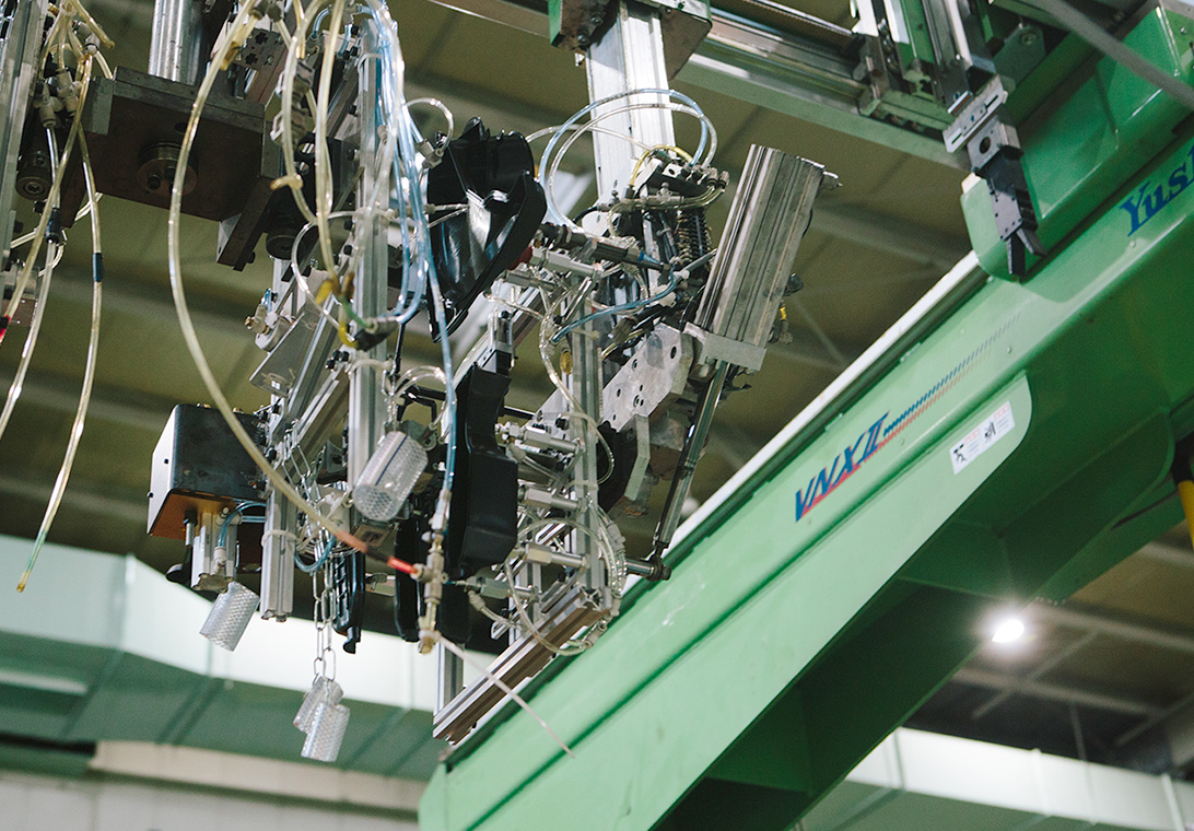 Molded products are placed on a conveyor by the ejector. They undergo static neutralization on their way to the next process so that they can be painted.