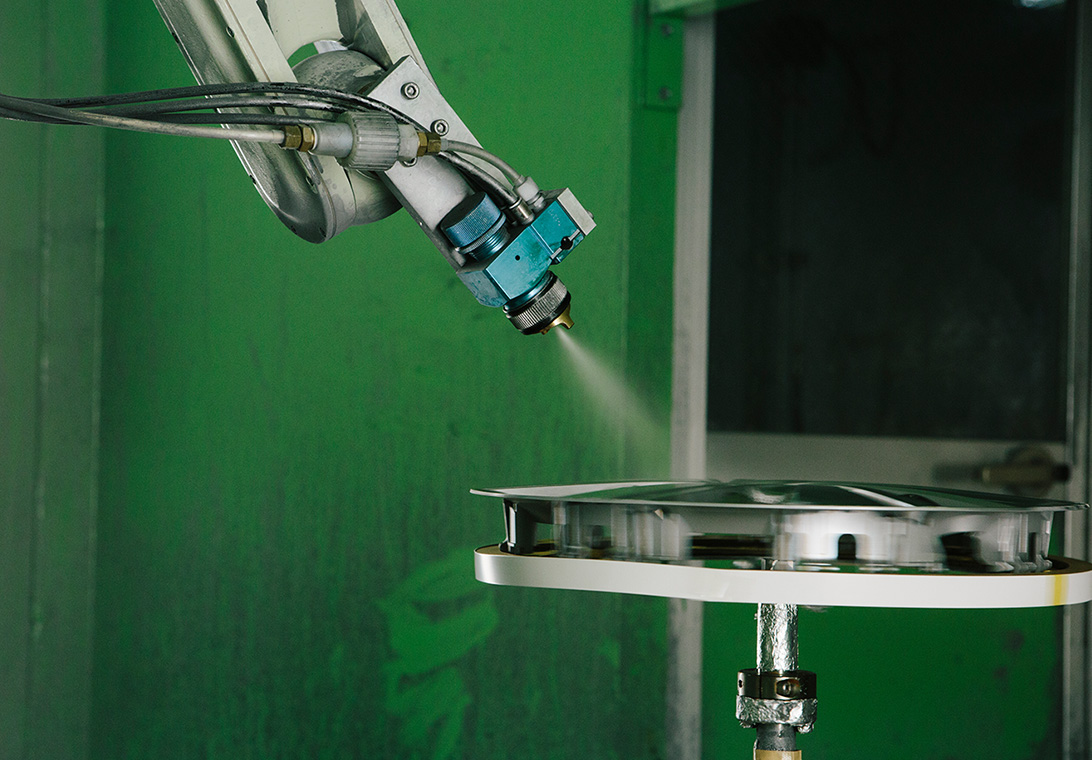 Parts whose static charge has been eliminated are transported automatically to the painting booth, where they are painted by a painting robot.