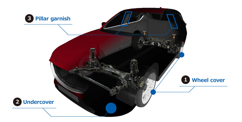 Undercovers are mounted underneath the engine, where they prevent chipping caused by stones flying up from the road surface. They also help improve the vehicle’s aerodynamic performance. They are injection molded and made primarily of polypropylene.