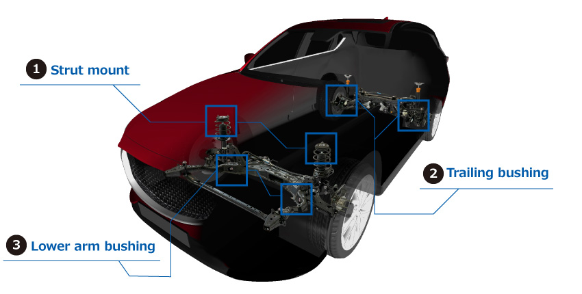 Lower arm bushings are rubber bushings that are installed on the lower part of the suspension and press-fit into the front of the vehicle to control vibrations transmitted from the tires. These parts have been optimized in terms of their structure and the rubber materials they use so that they can deliver a sophisticated blend of tracking and ride comfort. These integral-molded parts are manufactured by using cure adhesion to combine metal fittings and injection-molded components, and made primarily from natural rubber that has been formulated to optimize rebound characteristics.