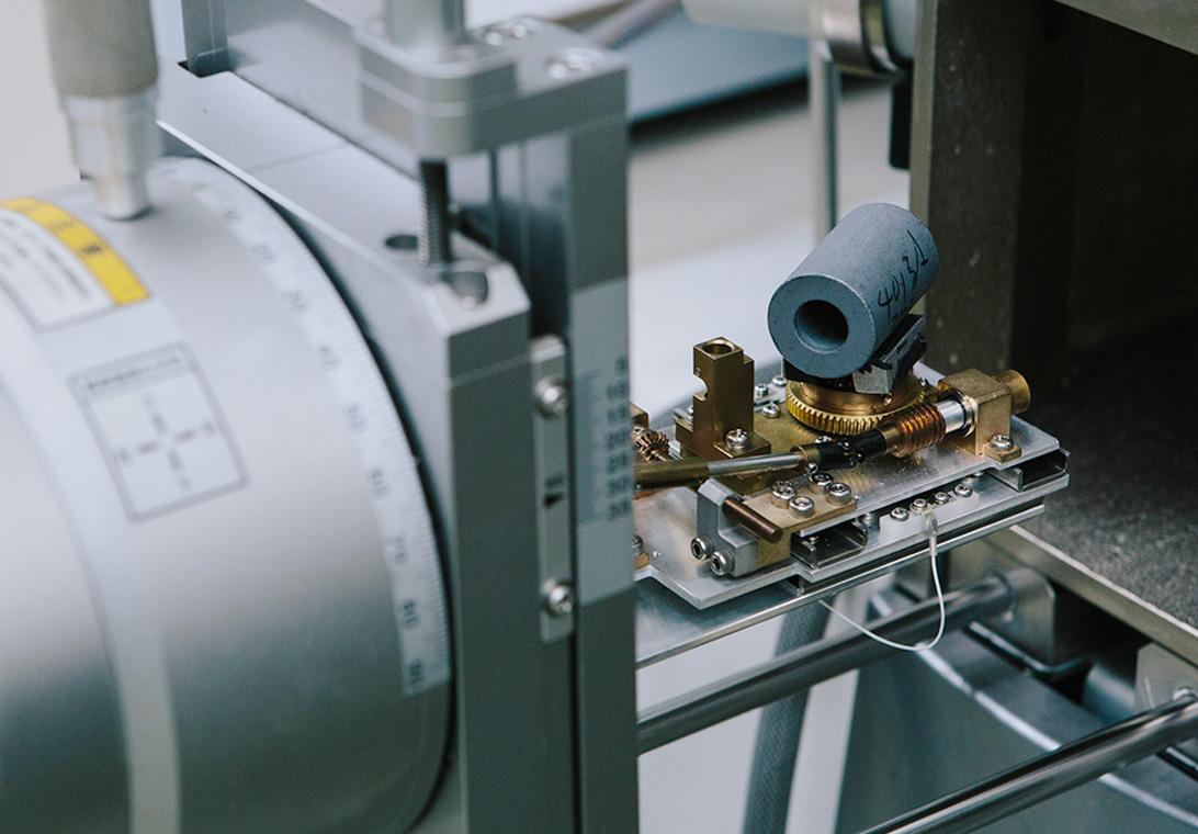試料表面から発生する二次電子や反射電子を検出して顕微鏡像を得る装置です。ストラットマウントやトレーリングブッシュといった金具付きの接着防振ブッシュが対象です。加硫接着の信頼性や耐久性を向上させるために、金具にリン酸亜鉛皮膜処理を施します。そのリン酸亜鉛皮膜が綺麗に形成されたかどうか確認する評価に利用しています。