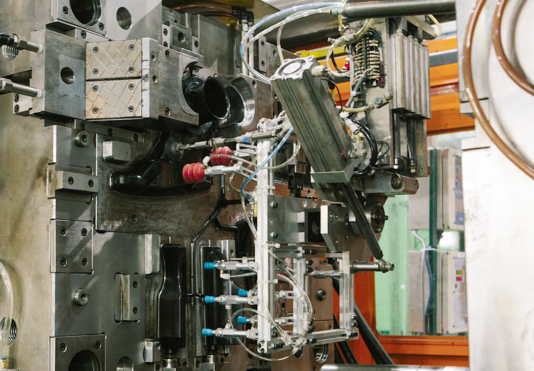 成形された製品は、中空構造が半分に分割された形になっているため溶着という工法を用いてくっつけます。この製品では熱板溶着という工法を採用しています。