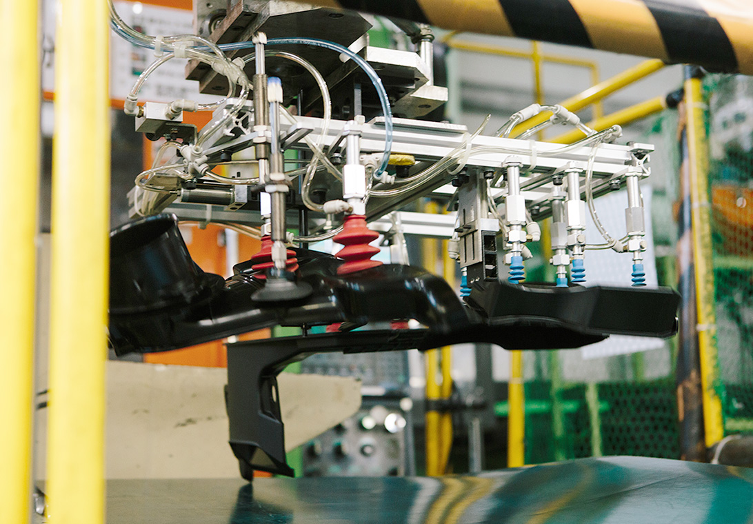 成形された製品は取出し機でコンベアに移されます。搬送の途中で、塗装のための除電が行われます。