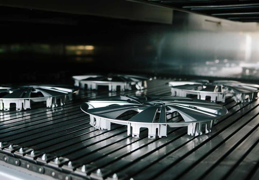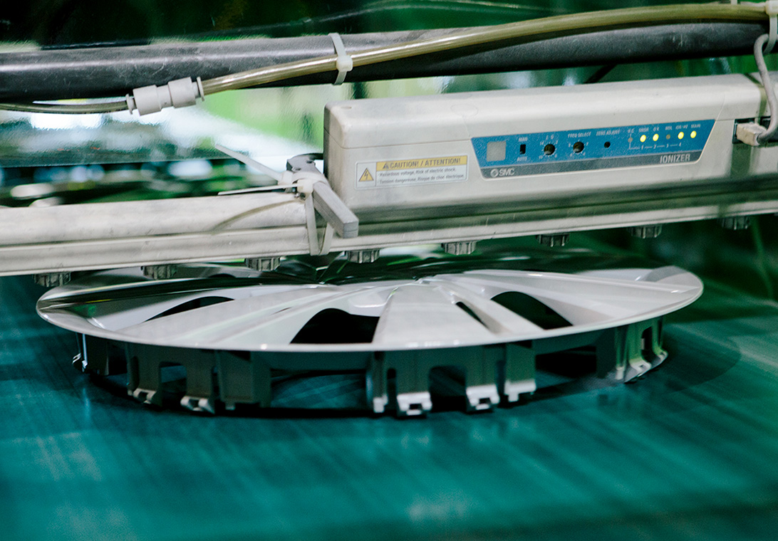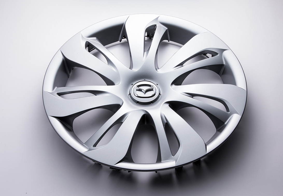 スチールホイールに装着され、意匠性を向上させるための部品です。一方で高速で回転するタイヤ部に装着されるため機能要求も高い部品です。