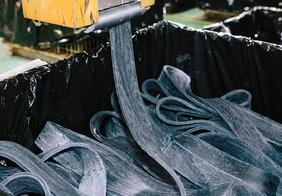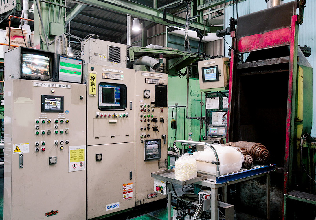 工業用ゴムにはいろいろな配合物が練り込まれています。原材料を裁断・計量した後、混練機に投入して練り込みます。
