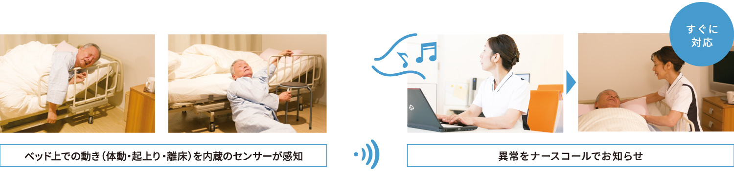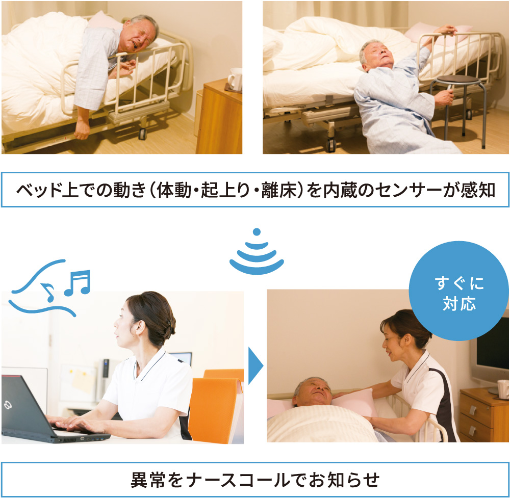 など、日中・夜間に利用者様の身体の異常をマットレス内蔵のセンサーが感知すると、ナースコールを通じてお知らせします。