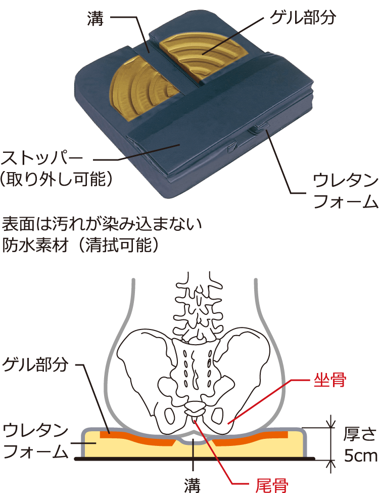 また、ゲルとウレ夕ンフォームの2層構造により坐骨部周辺にかかる圧迫力を低減します。