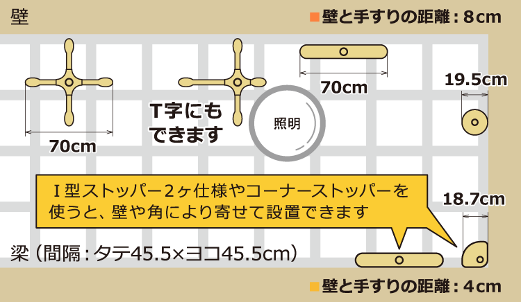 天井への負担が少なく、梁を確実にとらえる安定感抜群の標準ストッパーです。