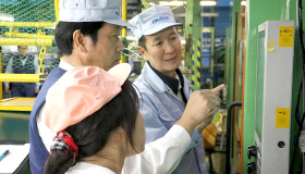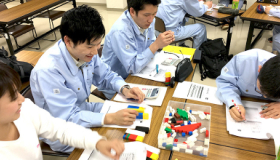 自動車業界の考え方を基準とし、技術系新入社員は1年間、自動車部品の工場で、製造実習を中心にモノづくりを学びます。トヨタ生産方式の考え方で改善を行ったり、企画、設計、量産という工程を体現する実習として、自分のアイデアを形にする椅子づくりを行い、最終成果として発表します。