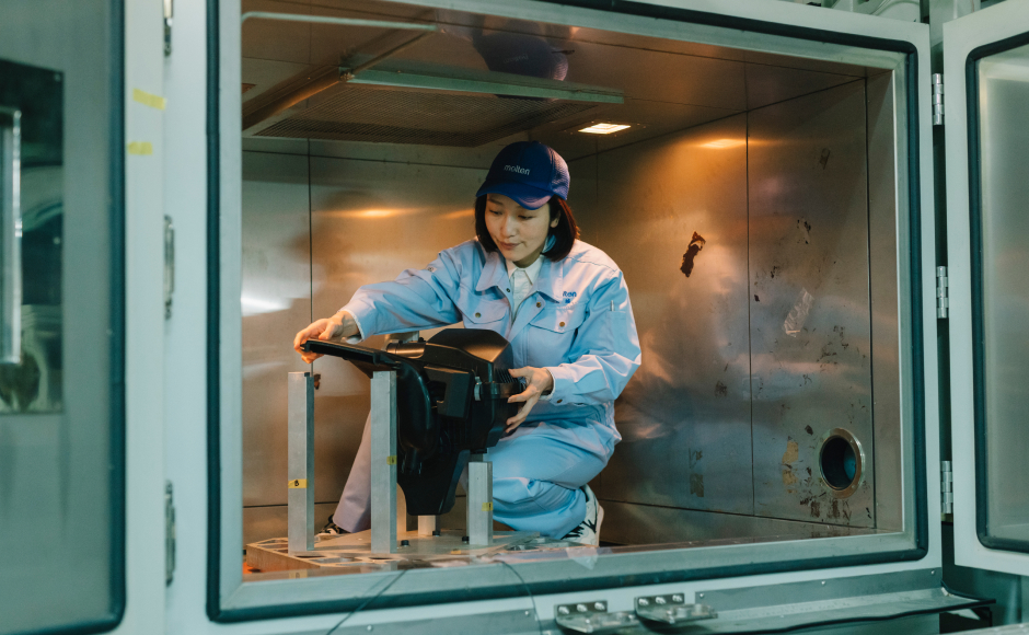 私は今、自動車のエンジン回りの吸気系、冷却系に関わる部品の設計を担当しており、現在6名で構成されるメンバーの一員です。