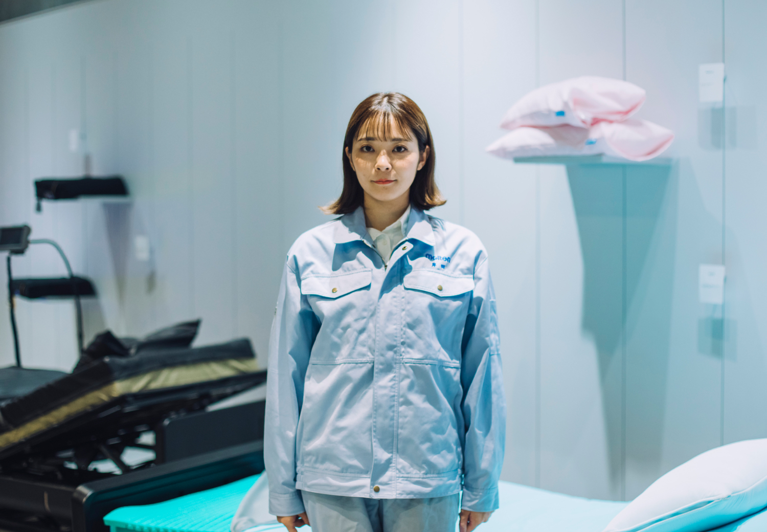 現在は、健康用品(医療・福祉用具)の品質保証に携わっています。主な担当は、医療・福祉の現場で使用されるマットレスです。お客さまに製品をより長く、安全にお使いいただくためには、「どのような扱いで製品が壊れるのか」「どのように劣化していくのか」を把握することが欠かせません。一つひとつの製品について、実験と評価を通じて安全性や耐久性を厳格に確認しています。地道な検証の積み重ねが、現場で安心して使われる製品につながっていると考え、日々の業務に向き合っています。