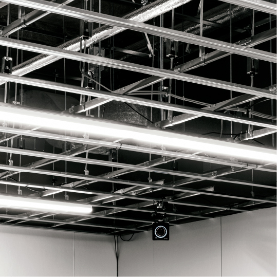 研究室としての機能を満足させるために、仕上げ素材に配慮。またモーションキャプチャのカメラの位置を変更しやすいよう、通常は天井下地で仕上げをすると隠れるLGSをあえてむき出しに。壁面や床の反射率も抑えている。清潔感のある凜としたラボスペースを目指した。